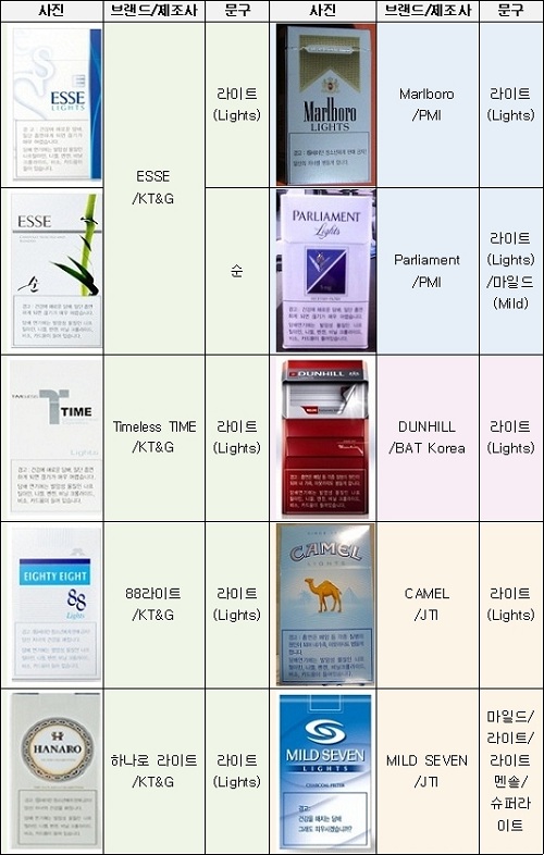 대표적인 브랜드가 KT&G의 ‘에쎄 라이트’, ‘에쎄 순’, ‘타임리스타임 라이트(Timeless TIME Lights)’등과 외국 담배인 ‘말보로 라이트(Marlboro Lights)와 ‘팔리아멘트 라이트(Parliament Lights)’, ‘팔리아멘트 마일드’ 등이었다.