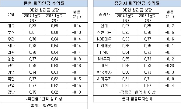 은행연합회와 금융투자협회, 생명보험협회, 손해보험협회 등에 따르면 확정급여형(DB) 원리금보장상품 적립금이 1천억 원 이상인 35개 금융사 모두 올해 1분기 수익률이 전년 동기에 비해 일제히 하락했다.