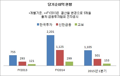 한국투자증권은 지난해 2천201억 원의 당기순이익으로 업계 2위를 기록했고 업황이 좋지 않던 2013년에는 755억 원으로 업계 1위를 차지했다.