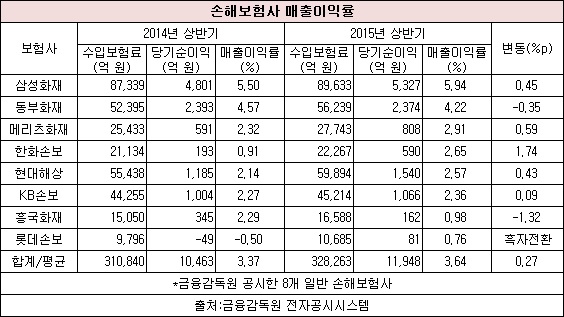 금융감독원에 공시한 8개 일반 손해보험사의 올 상반기 평균 매출이익률은 3.64%로 전년 동기에 비해 0.27%포인트 올랐다.