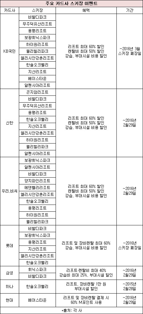 주요 전업계 카드사들은 스키장 이용 고객들을 사로잡기 위해 경쟁적으로 할인 이벤트에 돌입했다.