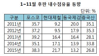 반면 경쟁사인 포스코(대표 권오준)와 동국제강(대표 장세욱)의 내수점유율은 정체 혹은 하락세다. 포스코의 경우 2011년 1~11월 후판 내수점유율이 35.7%였고, 2013년에는 39.2%까지 올랐으나 올해 38.3% 수준으로 줄어들었다.