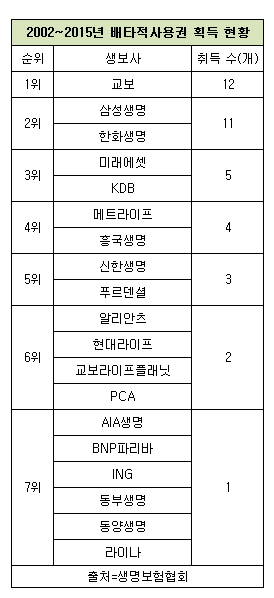 19개 생보사 중 교보생명은 12개로 배타적사용권 획득 수가 가장 많았다.