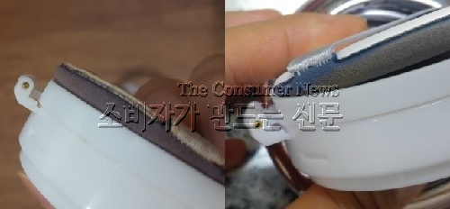 ▲ 아모레퍼시픽 쿠션화장품의 경칩 연결부위 나사의 구멍이 있고(왼쪽) 없음으로 짝퉁이 발견됐다.