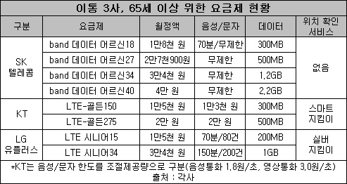 SK텔레콤, KT, LG유플러스 등 이동통신 3사는 65세 이상 어르신들을 위해 LTE 요금제 서비스를 제공하고 있다. 각 사별로 음성과 문자, 데이터 등의 제공한도는 차이가 있다.