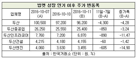 두산인프라코어의 경우 연초 4천400원에서 10월4일 7천930원으로 두 배 가까이 뛰었던 주가는 10일 7천200원으로 7.2% 떨어진 데 이어 11일에는 6천870원까지 밀렸다. 두산엔진(대표 김동철) 주가 역시 올 초 3천120원에서 10월4일 기준 4천197원까지 올랐지만 10일 3천630원으로 크게 하락했다.