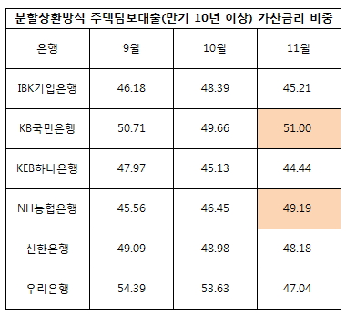 같은 기간 가산금리 상승폭 역시 NH농협은행이 0.2%포인트 오른 1.51%로 1위를 차지했다.