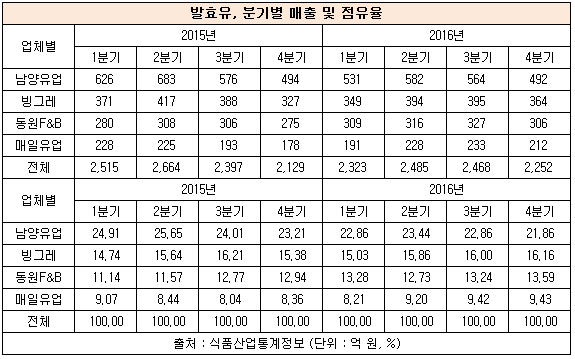 남양유업과 빙그레, 동원F&B가 1~3위를 지키고 있고 매일유업이 4위로 치고 올라오는 양상이다. 이외에 풀무원다논과 푸르밀, 서울우유가 혼전을 벌이고 있다.