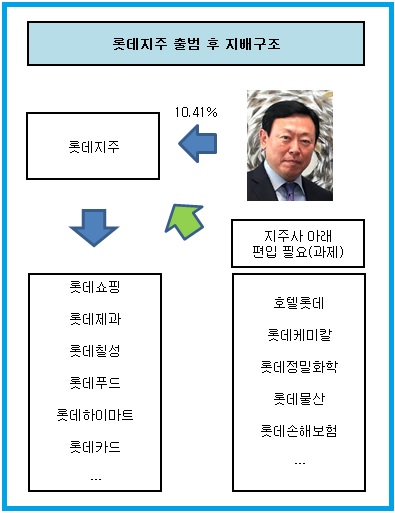 지주사 체제로 전환하고 순환출자를 해소했지만 롯데그룹의 지배구조 개편은 작업은 아직 마무리된 게 아니다. 호텔과 화학 계열이 롯데지주체제 지배 고리의 밖에 있다.
