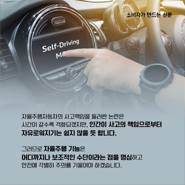 #6. 자율주행자동차의 사고책임을 둘러싼 논란은 시간이 갈수록 격화되겠지만, 인간이 사고의 책임으로부터 자유로워지기는 쉽지 않을 듯 합니다. 그러므로 자율주행 기능은 어디까지나 보조적인 수단이라는 점을 명심하고 안전에 각별히 주의를 기울여야 하겠습니다.