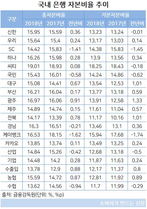 반면 씨티은행·광주은행·케이뱅크·경남은행·하나은행·부산은행 등은 16%대를 웃돌며 안정적인 재무구조를 보였다.
