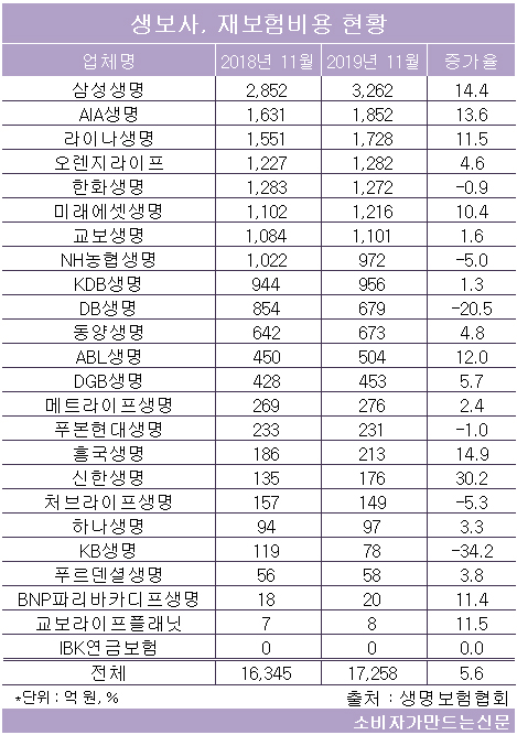 생명보험협회에 따르면 24개 생보사가 지난해 11월까지 재보험사에 지불한 재보험비용은 1조7258억 원으로 전년 동기 대비 5.6% 증가했다.