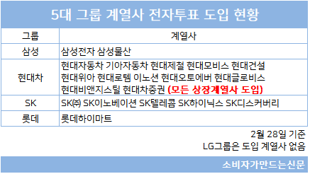한편 국내 5대 그룹의 경우 전자투표제 도입 여부에 대해 그룹사별로 온도차가 있다.