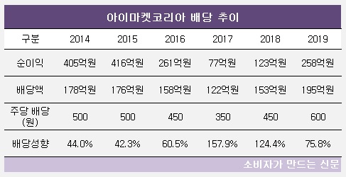 아이마켓코리아는 2019년 회계연도에 주당 600원의 배당을 결정했다. 역대 최대 규모다. 배당총액은 195억 원으로 전년에 비해 27.6% 증가했다. 2019년도 배당성향은 75.8%에 달한다.