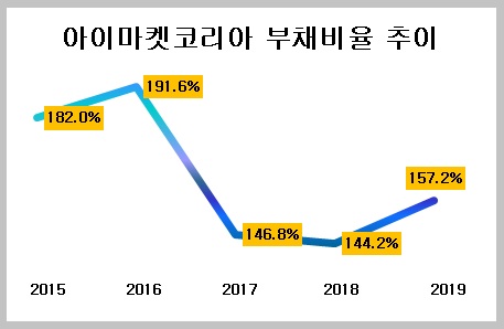 아이마켓코리아는 지난해 부채비율이 157.2%로 전년보다 13%포인트 높아졌다. 이 회사의 부채비율은 2016년 191.6%로 높았지만 2017년과 2018년에는 140%대로 개선됐다.