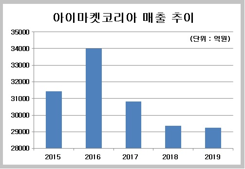 아이마켓코리아 매출은 2016년 3조4000억 원을 기록한 이후 지난해까지 매년 꾸준히 감소하고 있다. 매출은 연평균 4.7%씩 줄고 있다. 아이마켓코리아 매출의 80%는 삼성그룹 계열사와의 거래가 차지하고 있다. 삼성 계열사가 투자를 줄이면 매출에 큰 영향을 받는 구조다.