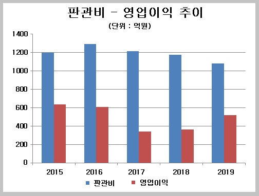 지난해 판관비는 1083억 원으로 전년에 비해 94억 원 감소했다. 최근 5년 동안 감소액이 가장 컸다.