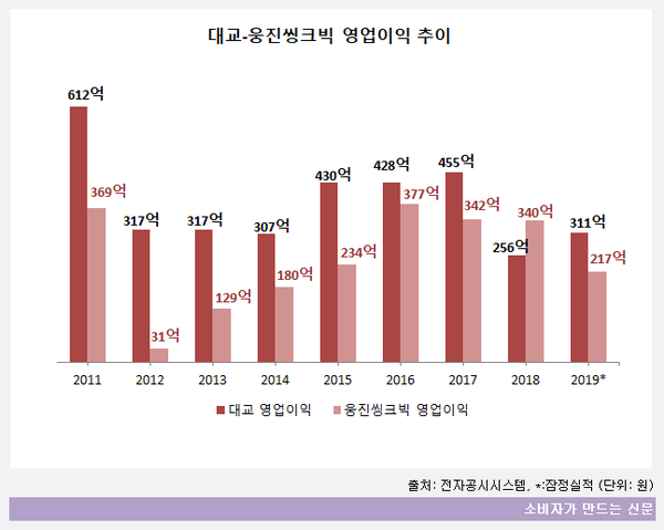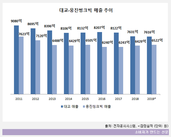 대교의 매출이 지속적으로 줄어들면서 업계 2위 웅진씽크빅과의 격차도 좁혀졌다.
