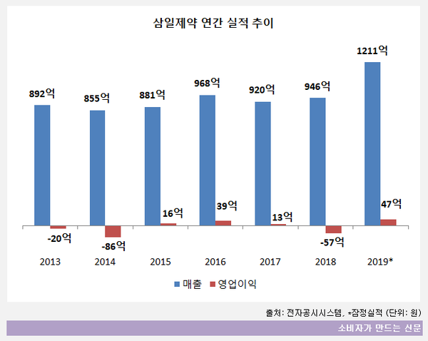 금융감독원 전자공시시스템에 따르면 삼일제약의 지난해 잠정매출은 연결기준 1211억 원으로 전년도 946억 원에 비해 28%나 늘었다. 2018년 영업적자 57억 원을 냈으나 지난해에 영업이익 47억 원을 기록하며 흑자 전환했다.