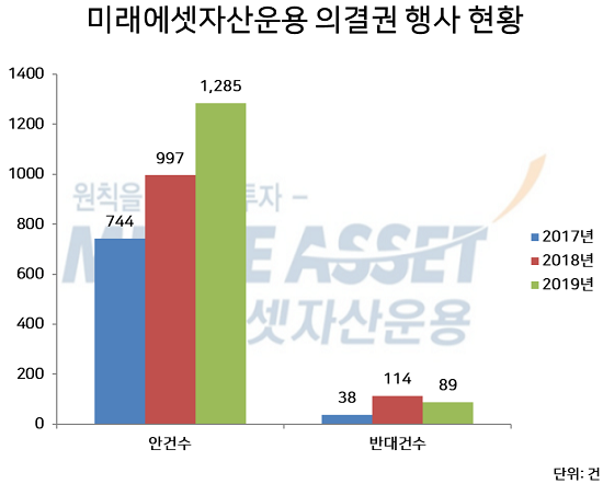 미래에셋자산운용의 주주활동 연간보고서에 따르면 지난해 미래에셋자산운용은 총 183개사, 1285개 안건에 대해 의결권을 행사했다. 전년 대비 의결권 참여 회사 수는 41개사, 안건은 288건 늘었다.