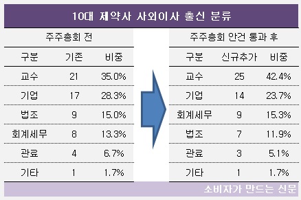 주총 안건이 통과될 경우 10대 제약사 사외이사 및 감사에서 교수 출신이 차지하는 비중은 35%에서 42.4%로 7.4%포인트 높아진다.