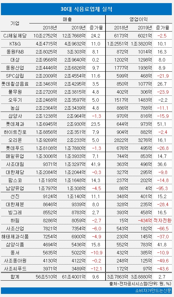 상장기업 가운데 매출 기준 30대 식음료기업의 지난해 매출 총액은 61조4001억 원으로 전년보다 9.6% 증가했고, 영업이익 총계는 3조8880억 원으로 3% 늘었다. 영업이익이 매출 증가를 따라가지 못하면서 평균 영업이익률은 6.8%에서 6.3%로 낮아졌다.