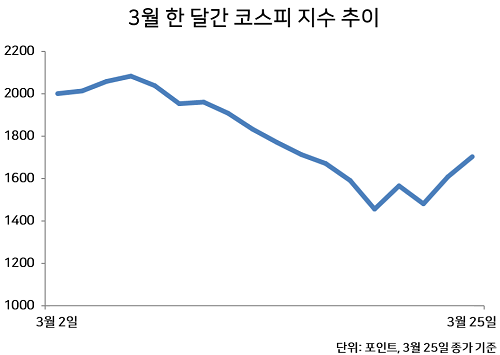 실제로 국내 코스피 지수는 지난 2일 2002.51 포인트로 시작했지만 코로나 팬데믹 선언 이후 급락하며 지난 19일 종가 기준 1457.64포인트까지 추락했다. 불과 17일 만에 지수가 30% 가까이 급락한 셈이다.