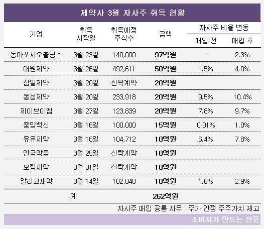 금융감독원 전자공시시스템에 따르면 3월 들어 27일까지 자사주 취득에 나선 제약바이오 기업은 총 10곳에 자사주 취득액은 총 262억 원이다.