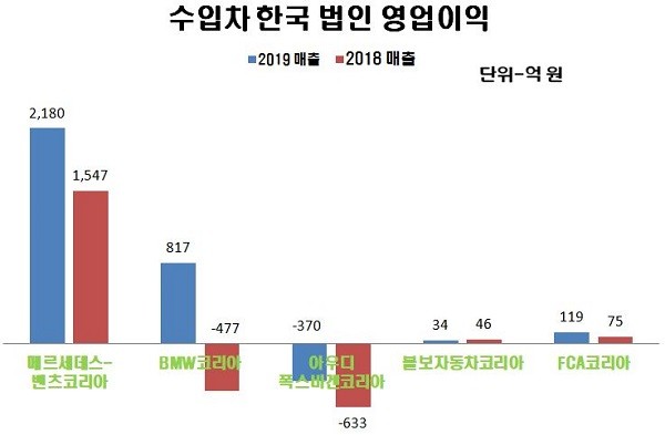 메르세데스-벤츠코리아(사장 디미트리스 실라카스)가 지난해 판매량 신기록을 세우면서 연간 매출과 영업이익도 크게 증가했다.  BMW코리아(사장 한상윤)는 매출이 줄면서 벤츠와 격차가 더 벌어졌지만 영업이익이 적자에서 흑자로 돌아서면서 수익성 개선에 성공했다.