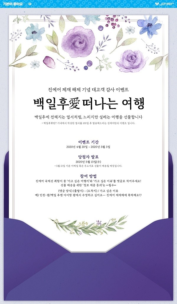 진에어가 ‘백일후愛 떠나는 여행’ 이벤트를 다음 달 3일까지 진행한다. 그동안 아낌없는 사랑을 보내준 고객들에게 감사 인사를 전하기 위한 이벤트다.