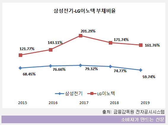 금융감독원 전자공시에 따르면 지난해 말 기준 삼성전기의 부채비율은 59.74%, LG이노텍은 161.76%를 기록했다. 삼성전기가 부채비율을 지난해에 비해 15.03%포인트 개선했고 LG이노텍은 9.98%포인트 하락하면서 양사의 격차는 더 벌어졌다.
