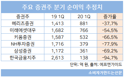 금융정보업체 에프엔가이드에 따르면 올해 1분기 주요 증권주의 순이익은 전년 대비 30~90%가량 감소할 것으로 예측되고 있어 증권사들의 한숨도 깊어지고 있는 상황이다.