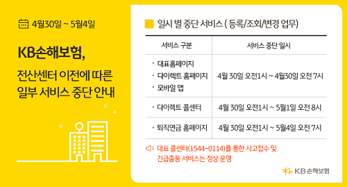 전산센터 이전에 따라 오는 4월 30일부터 5월 4일 새벽까지 KB손해보험 대표 홈페이지 및 다이렉트 홈페이지, 모바일앱, 다이렉트콜센터, 퇴직연금 홈페이지 등이 일시 중단될 예정이다.