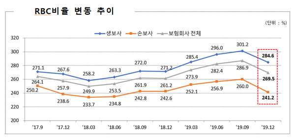 금감원에 따르면 지난해 말 생명보험사 RBC비율은 284.6%, 손해보험사 RBC비율은 241.2%였다. 지난해 9월 말에 비해 생명보험사는 16.5%포인트, 손해보험사는 18.9%포인트 떨어졌다.