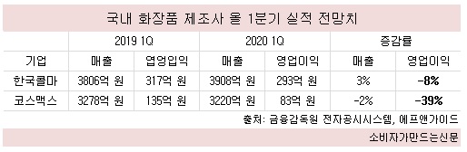지난해 견조한 실적을 이어온 화장품 제조사 한국콜마(대표 윤상현‧안병준‧이호경)와 코스맥스(대표 최경‧이병만)가 코로나19사태로 올 1분기 실적 부진을 피하지 못한 것으로 분석된다.
