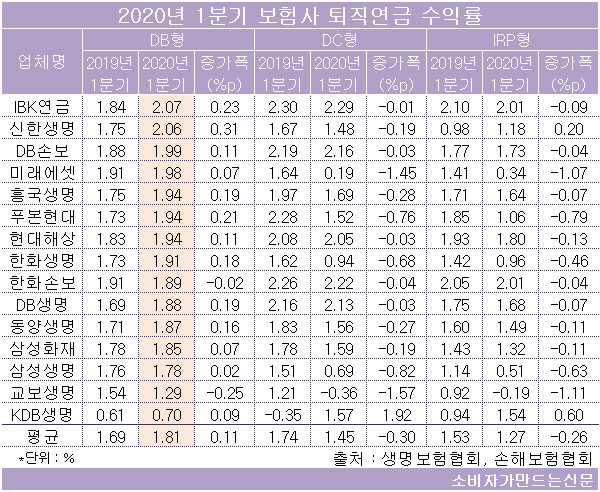 보험사들이 보수적으로 운영하는 DB형의 경우 한화손해보험, 교보생명 2곳을 제외하고 모두 지난해 1분기보다 수익률이 높아졌다.