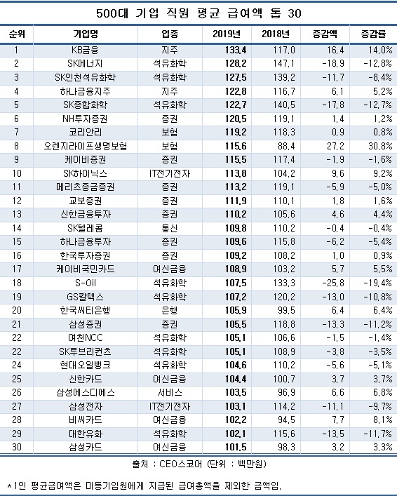 이밖에 메리츠종금증권(1억1320만 원), 교보증권(1억1190만 원), 신한금융투자(1억1020만 원), SK텔레콤(1억980만 원), 하나금융투자(1억960만 원), 한국투자증권(1억920만 원), KB국민카드(1억890만 원), S-Oil(1억750만 원), GS칼텍스(1억720만 원), 한국씨티은행(1억590만 원), 삼성증권(1억550만 원), 여천NCC‧SK루브리컨츠(각 1억510만 원), 현대오일뱅크(1억460만 원), 신한카드(1억440만 원), 삼성SDS(1억350만 원), 삼성전자(1억310만 원), 비씨카드(1억220만 원), 대한유화(1억210만 원), 삼성카드(1억150만 원), SK이노베이션(1억40만 원), 하나은행(1억20만 원), 신한지주(1억10만 원) 등 총 33개 기업 직원의 평균 연봉이 1억 원을 넘었다.