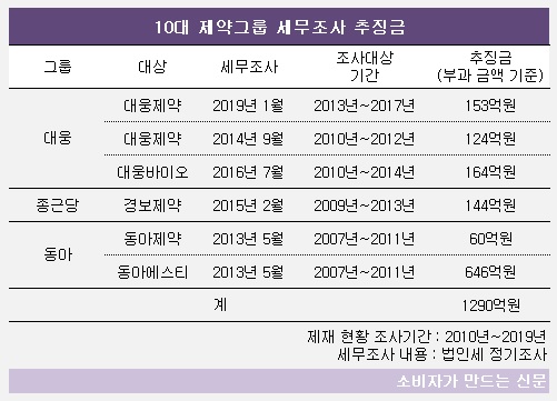 금융감독원 전자공시시스템에 따르면 2010년부터 지난해까지 10년 동안 국세청 정기세무조사를 통해 추징금을 부과 받은 곳은 대웅, 종근당, 동아쏘시오 등 3 곳이다. 이들이 법인세 정기조사를 통해 받은 추징금은 총 1290억 원에 이른다.