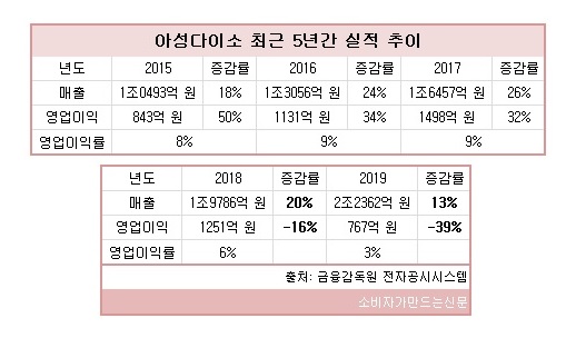 아성다이소는 지난 2017년까지 매출‧영업이익 모두 두자릿수 비율로 성장하는 고공행진을 이어왔다.