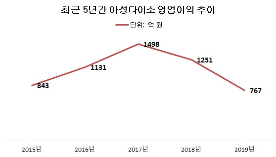 금융감독원 전자공시시스템에 따르면 아성다이소 지난해 영업이익은 767억 원으로 전년도 1251억 원에 비해 39% 감소했다. 같은 기간 매출은 13% 증가하며 2015년 이후 5년 연속으로 두 자릿수 증가율을 유지했다.