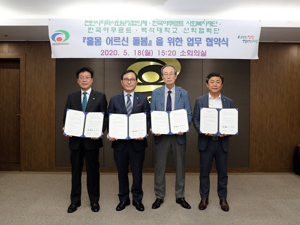 한국야쿠르트와 한국야쿠르트 사회복지재단은 지난 18일 천안시 지역사회복지협의체, 백석대학교와 지역 내 ‘홀몸어르신 돌봄사업’을 위한 업무협약(MOU)를 체결했다고 19일 밝혔다.