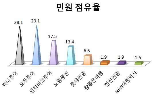 3위는 인터파크투어로 17.5%, 4위는 노랑풍선으로 13.4%, 5위는 롯데관광으로 6.6%였다. 참좋은여행, 한진관광, NHN여행박사는 1%대의 민원 점유율을 기록했다.