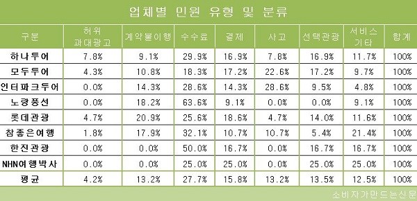 여행사별로 하나투어는 ▷수수료 불만이 가장 높았고 ▷결제 ▷선택관광 민원이 16.9%로 동률을 이루었다. 취소나 변경 시 수수료 과다 책정에 대한 불만이 다수였고 담당자 착오로 출발 날짜가 바뀌었고 이로 인해 환불을 요청했지만 긴 시간 받지 못했다는 민원도 있었다. '허위과대광고(실제 여행상품이 광고내용과 다름)'에 대한 민원도 7.8%로 여행사 중 가장 높았다.