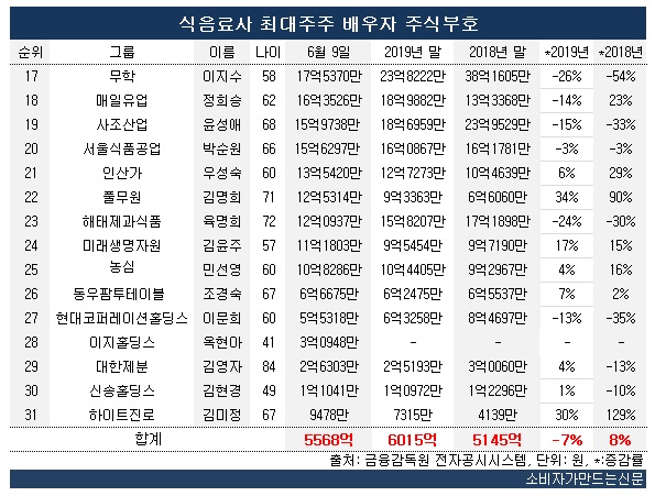 소비자가 만드는 신문이 50대 식품 상장기업 최대주주 직계 일가를 조사한 결과, 기업 지분을 보유한 오너의 배우자는 총 31명이다. 6월 9일 종가 기준 31인의 지분가치는 총 5568억 원으로 지난해 말 6015억 원보다 7% 줄어들었다.