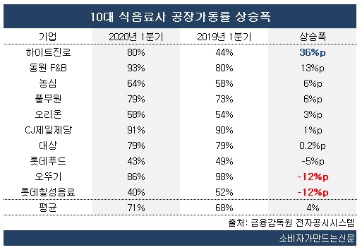 금융감독원 전자공시시스템에 따르면 국내 식음료 10개사의 올 1분기 평균 공장가동률은 71%로 1년 새 4%포인트 상승했다. 이 결과는 각사에서 가동시간·생산량 등을 기준으로 산출한 수치에 따른 것이다.