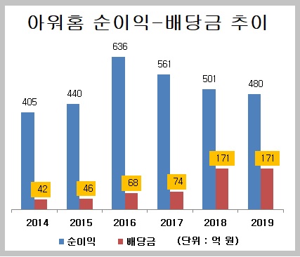 2014년 42억 원이던 배당금은 2018년과 2019년 171억 원으로 4년 사이 305.4% 증가했다.