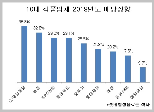 식품 업계에서 상대적으로 배당성향이 낮다는 설명이지만, 실제로는 그렇지 않다. 10대 식품업체의 2019 회계연도 배당성향은 평균 25.8%로 아워홈보다 크게 낮다.