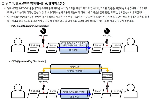 대표적인 보안강화 기술로는 국내에 널리 알려진 양자암호통신 기술과 최근 암호보안 영역에서 떠오르는 양자내성암호 기술이 있다.