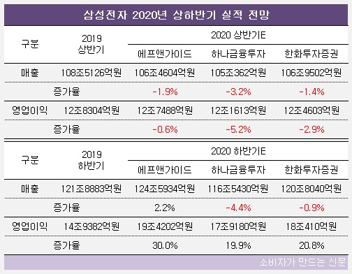 최근 일주일 이내에 발표된 증권사 전망치에 따르면 삼성전자는 올 상반기 105조 원에서 107조 원의 매출을 기록할 것으로 전망된다. 전년에 비해 1~3% 감소한 수준이다.
