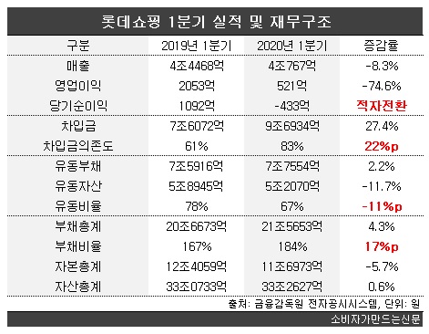 롯데쇼핑은 올 1분기 당기순손실 433억 원을 내며 전년 동기 1092억 원에서 적자전환 했다. 같은 기간 매출은 4조2268억 원 원에서 4조767억 원으로 8.3% 줄었고, 영업이익은 2053억 원에서 521억 원으로 74.6%나 감소했다.